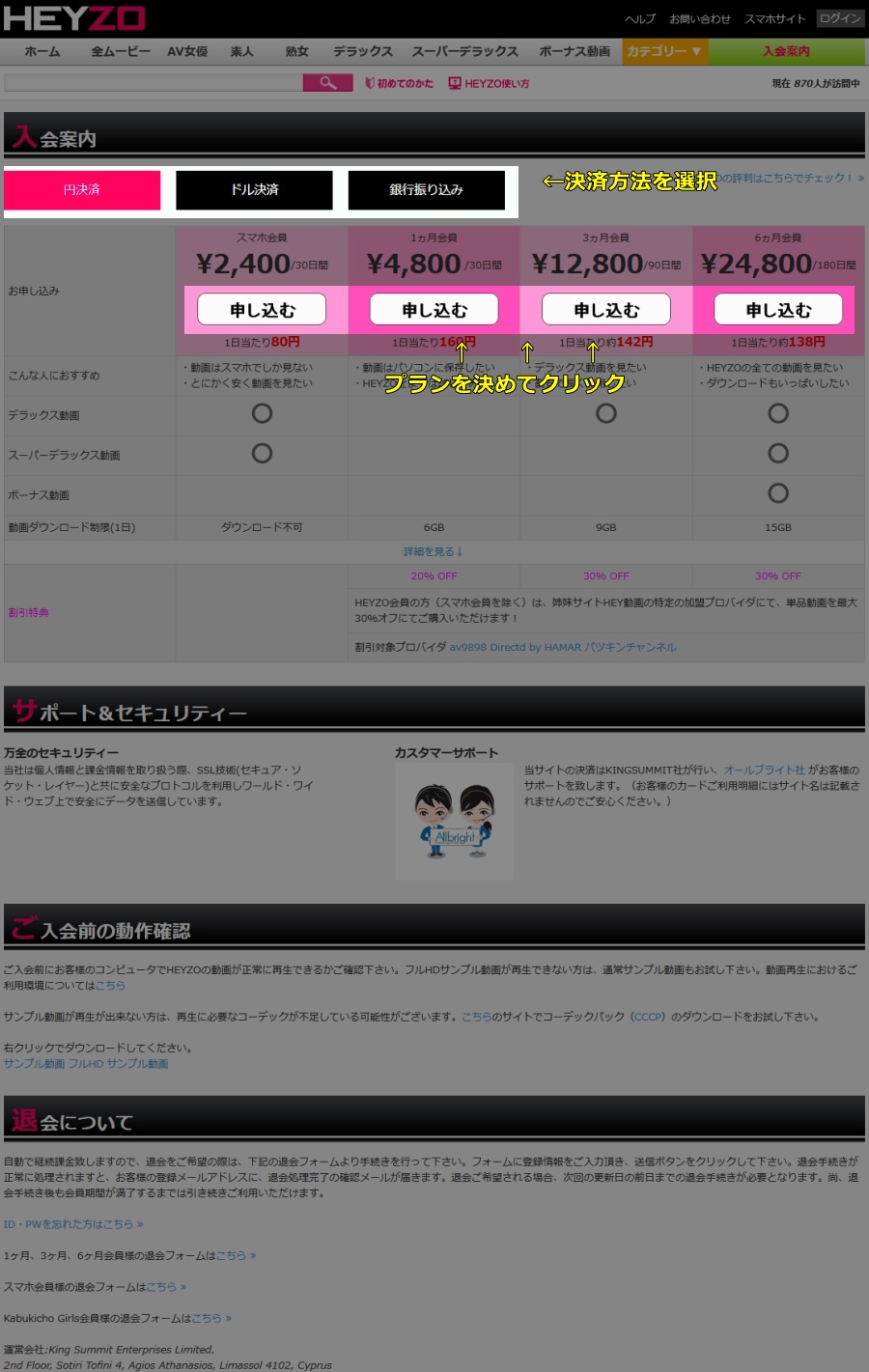 HEYZO(ヘイゾー)公式サイトの入会案内ページに移動すると、下の図のような画面に行きますので、支払方法(クレジットカード円決済、クレジットカードドル決済、銀行振り込み)を選択し、各プラン説明の横に「申し込む」と言うボタンが表示されていますので、入るプランを決定したら「申し込む」ボタンをクリックして下さい。