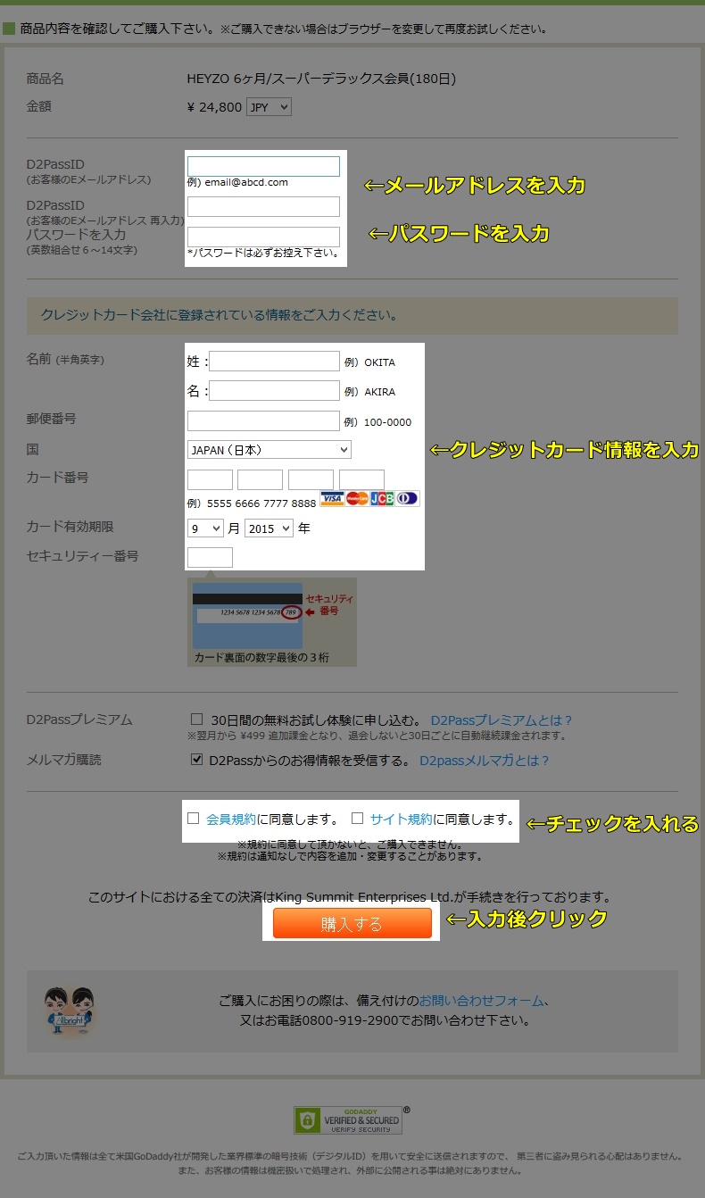 入るプランを決定し「申し込む」ボタンをクリックするとしたのような画面に行きますのでメールアドレス、パスワード(自分で決める)、クレジットカード情報を入力します。パスワードは忘れないようにメモに控えておきましょう。入力したら、「会員規約に同意します」「サイト規約に同意します。」にチェックを入れて「購入する」をクリックします。