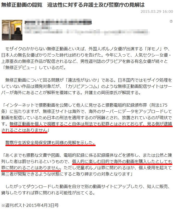 「裏サイトへいぞーのような無修整AVを個人で視聴すること自体は法律(刑法)でも違反とはされておらず、我々日本在住の個人がheizoのような無修正動画を視聴してもつかまることはありません」